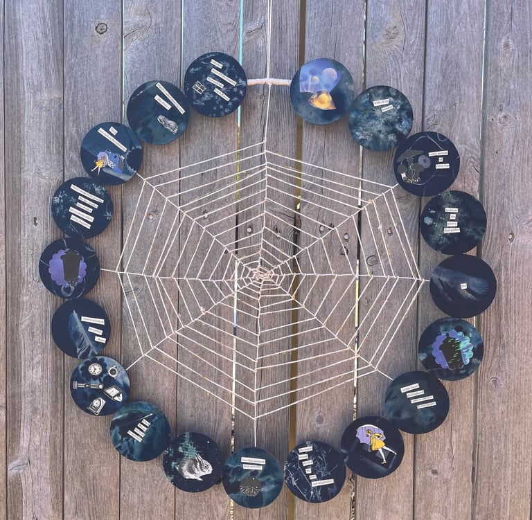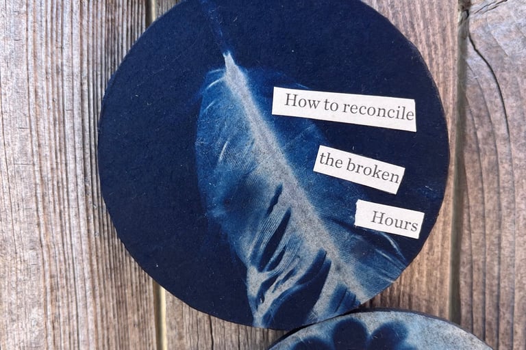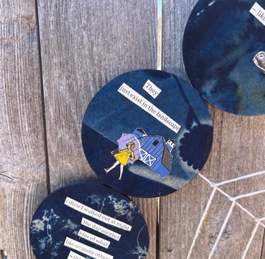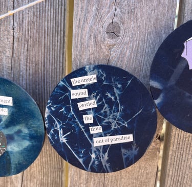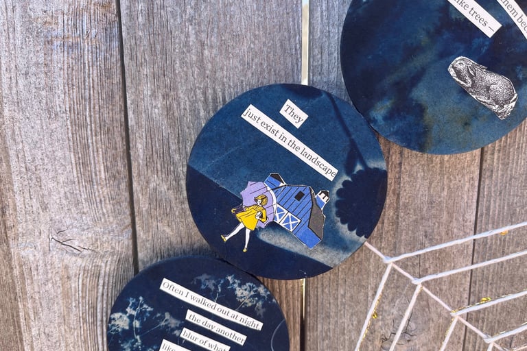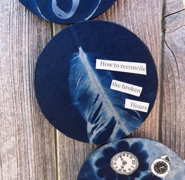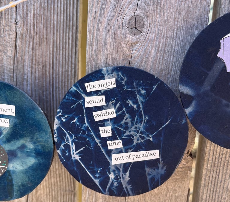 Dreamcatcher No. 1 - Collage, coffee filters, cyanotype, metal hoop, yarn ,2024